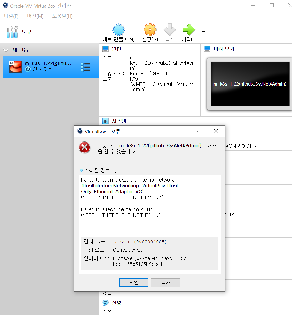 Stderr: VBoxManage.exe: error: Failed to open/create the internal network 'HostInterfaceNetworking-VirtualBox Host-Only Ethernet Adapter #3' (VERR_INTNET_FLT_IF_NOT_FOUND). 에러 해결