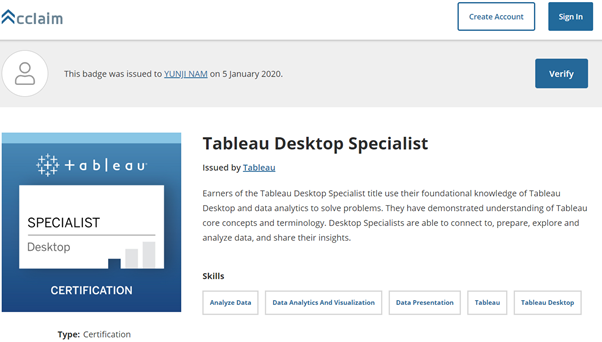2020.01.05 태블로 스페셜리스트 자격증을 취득했다!!