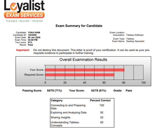 시험이 종료되면 다음 창으로 이동하면서 간단한 설문조사 화면이 나온다. 주로 시험은 몇 번째고 감독관의 태도에 대한 설문인데 체크 후 Submit 버튼을 누르면 두근두근 시험 결과 화면이 바로 나온다. 하지만 결과 화면은 금세 없어져 버려서 빠르게 확인해야 한다. 사실 12월 말에 자격증 시험에 도전했다가 60점으로 무참히 떨어졌다… 심기일전하여 이전에 공부했던 내용을 다시 한번 들여다보고 틀린 문제에 오답노트를 작성하였다. 자격증 시험은 문제은행식인지 이전에 나왔던 문제들이 틈틈이 보였던 것 같다. 특히 PDF로 출력하는 방법이나 차원(dimension), 측정값(measure), 불연속형(discrete)에 관한 문제는 동일하게 출제되었으니 기본적인 내용에 충실하면 어려울 것 없다. 다시 3일 공부하여 도전한 결과 81점이라는 결과를 얻을 수 있었다.